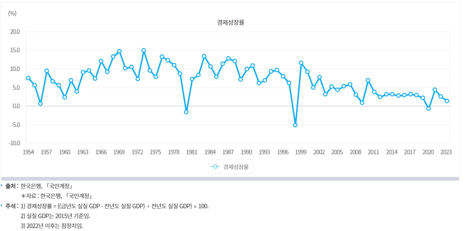 대한민국의 연간 GDP 성장률이 10%를 넘나들던 고도성장기는 60~80년대였지만 황금기는 아니었다.