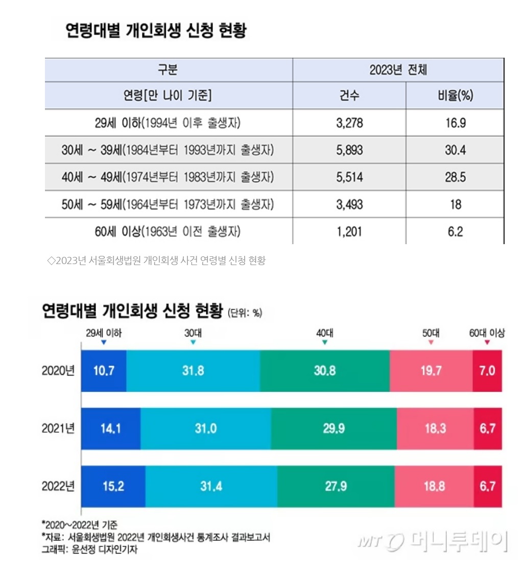 특히 한번 시용불량자가 되면 제대로 된 재기 기회가 사실상 주어지지 않는 대한민국에서 최근 3년간 개인회생 신청 비중에서 2-30대가 차지하는 비중이 40%가 넘는다는 것은 2-30년 후 대한민국이 얼마나 처참하게 망가져 있을지를 보여주는 가늠자로써 세계 유래가 없는 비극적 문제다.