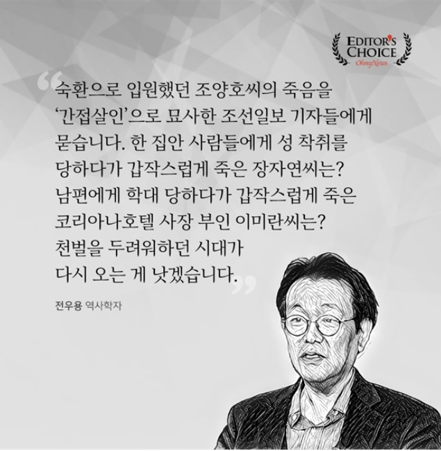 아래 부분은 역사학자 전우용 님이 한진그룹 조양호 회장의 죽음을 '적폐청산의 희생자'로 묘사한 자유한국당과 조선일보 등에게 질문한 내용이다.